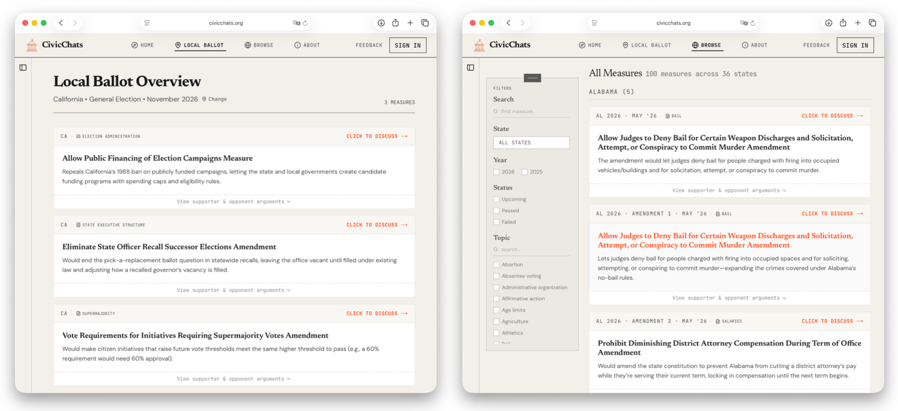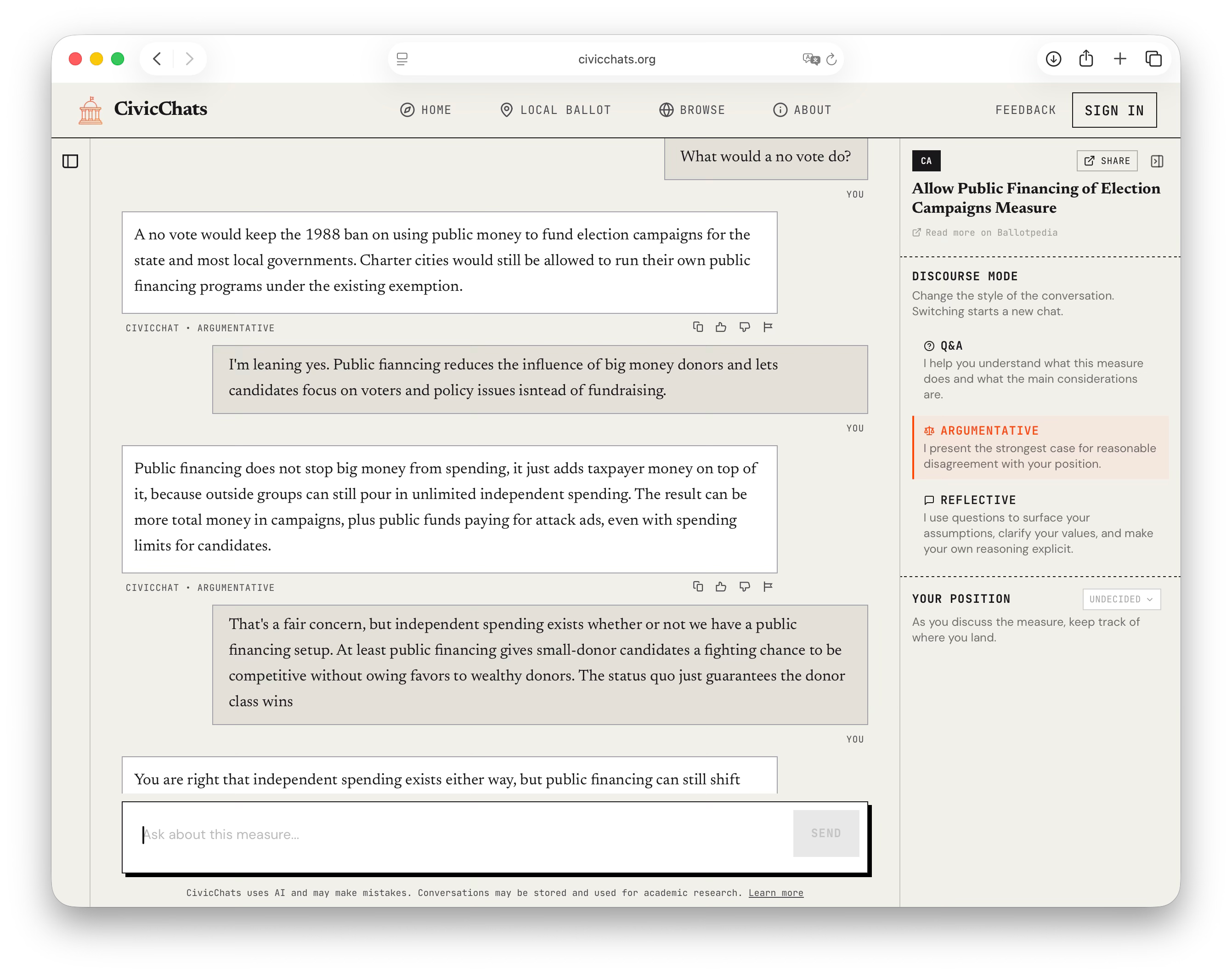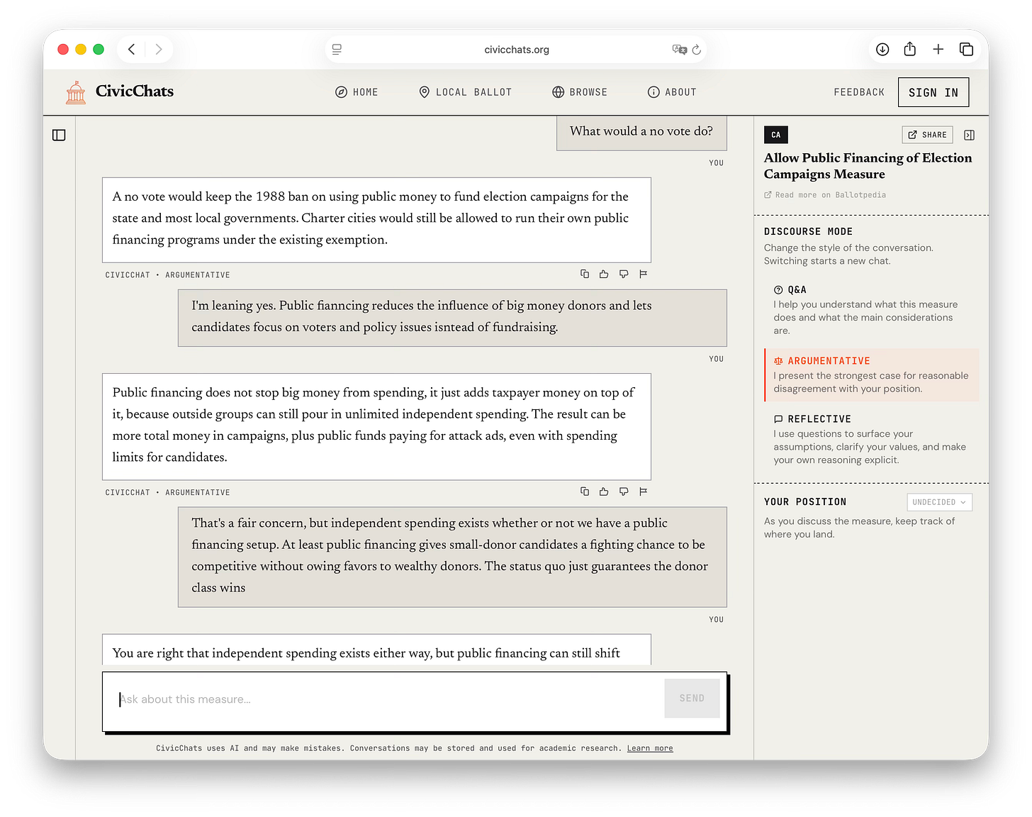 Discuss with the AI. Click any measure and a chat opens about it.5 Rather than a single mode of engagement, CivicChats offers three conversation styles:
