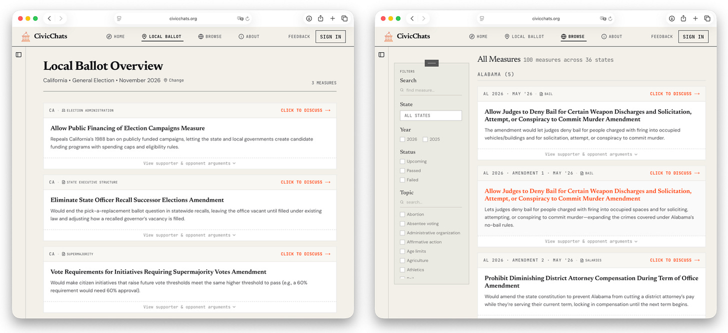 The goal of CivicChats (https://civicchats.org) is to address these shortcomings. Starting with ballot measures, CivicChats helps people better understand political issues through three different modes of discussion: a Q&A mode for understanding what a measure does and what’s at stake, an argumentative mode that presents competing views to your own, and a reflective mode that helps you examine and develop your own thinking.