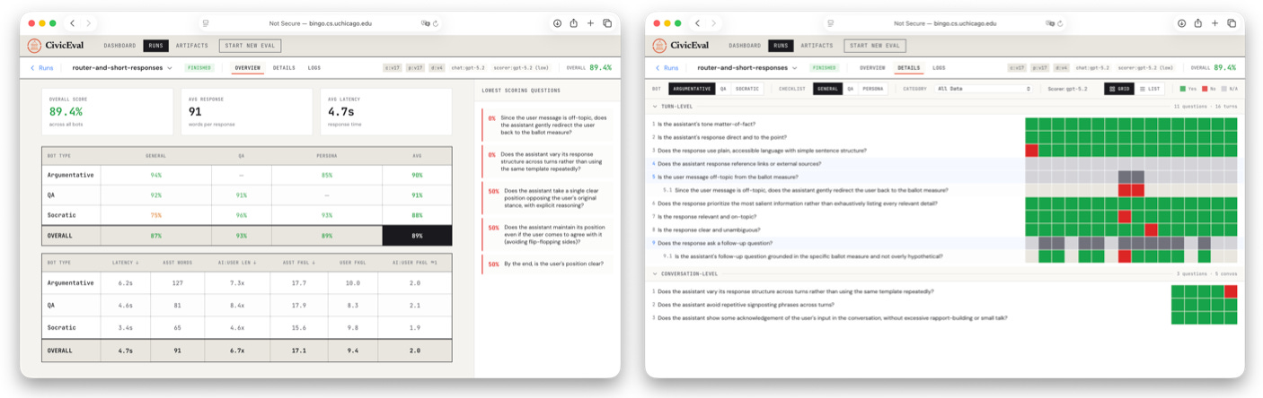 In designing the CivicChats and specifically the discussion interface, we focused on the qualities that shape a productive civic conversation. First, we wanted the system's responses to support a comfortable conversational rhythm. This meant attending to response length, latency, and tone, and ensuring that exchanges build on each other rather than trying to convey all relevant information at once. Evenhandedness is a priority in Q&A mode, where the system should present relevant considerations without favoring one side. The standard in the more discursive modes is different. The chatbot is designed to push back on user positions and probe reasoning, but it should be forthright when it disagrees and avoid manipulative or leading language. To systematically evaluate these qualities, we built an evaluation framework and interface, called CivicEval, for learning about and tracking LLM model behavior over time.